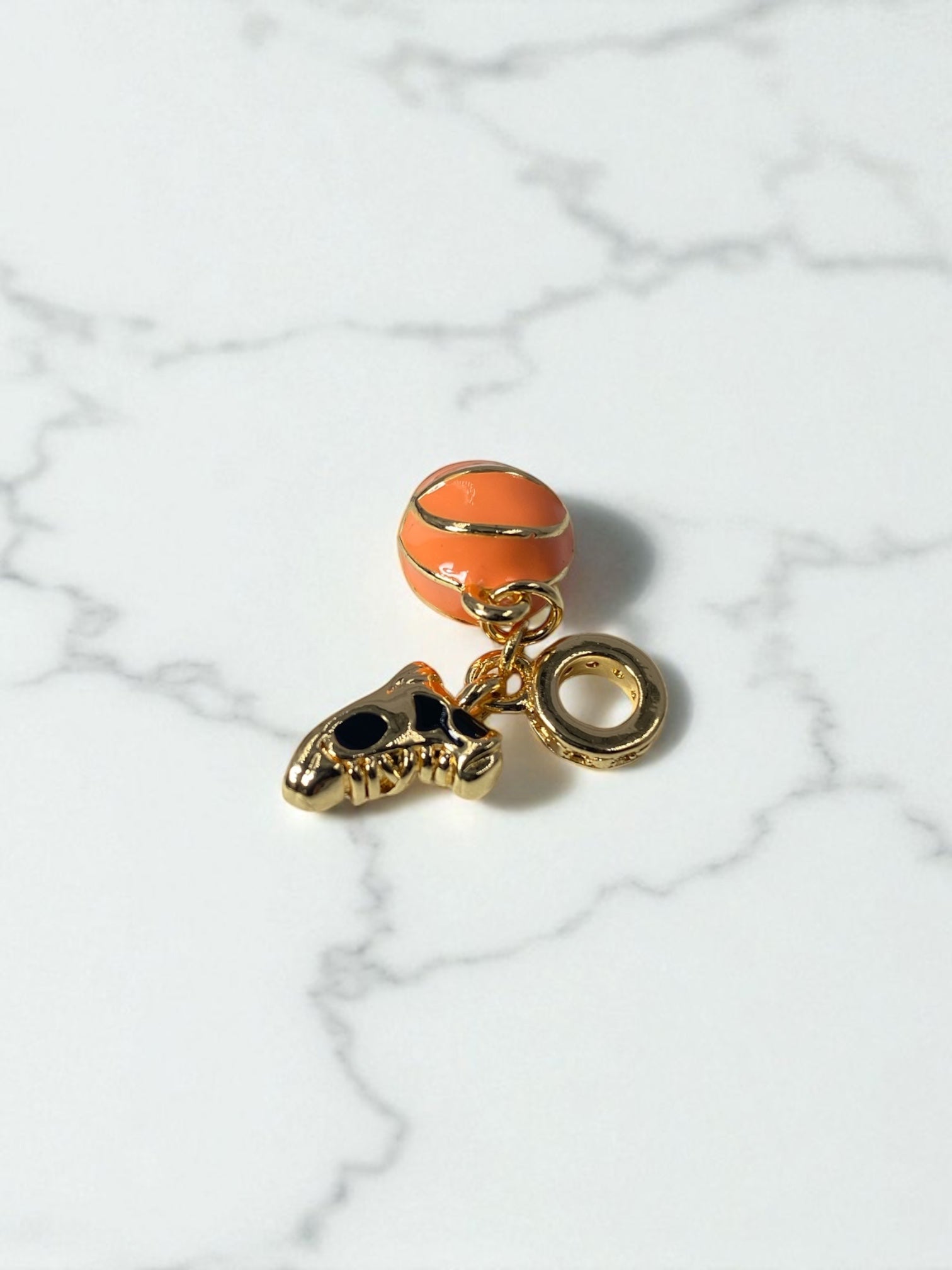 Este charm está diseñado para las almas apasionadas por el deporte. Con una mini pelota de baloncesto esmaltada en naranja vibrante y un tenis dorado con detalles negros, representa la energía, disciplina y fuerza que viven en la cancha y fuera de ella.