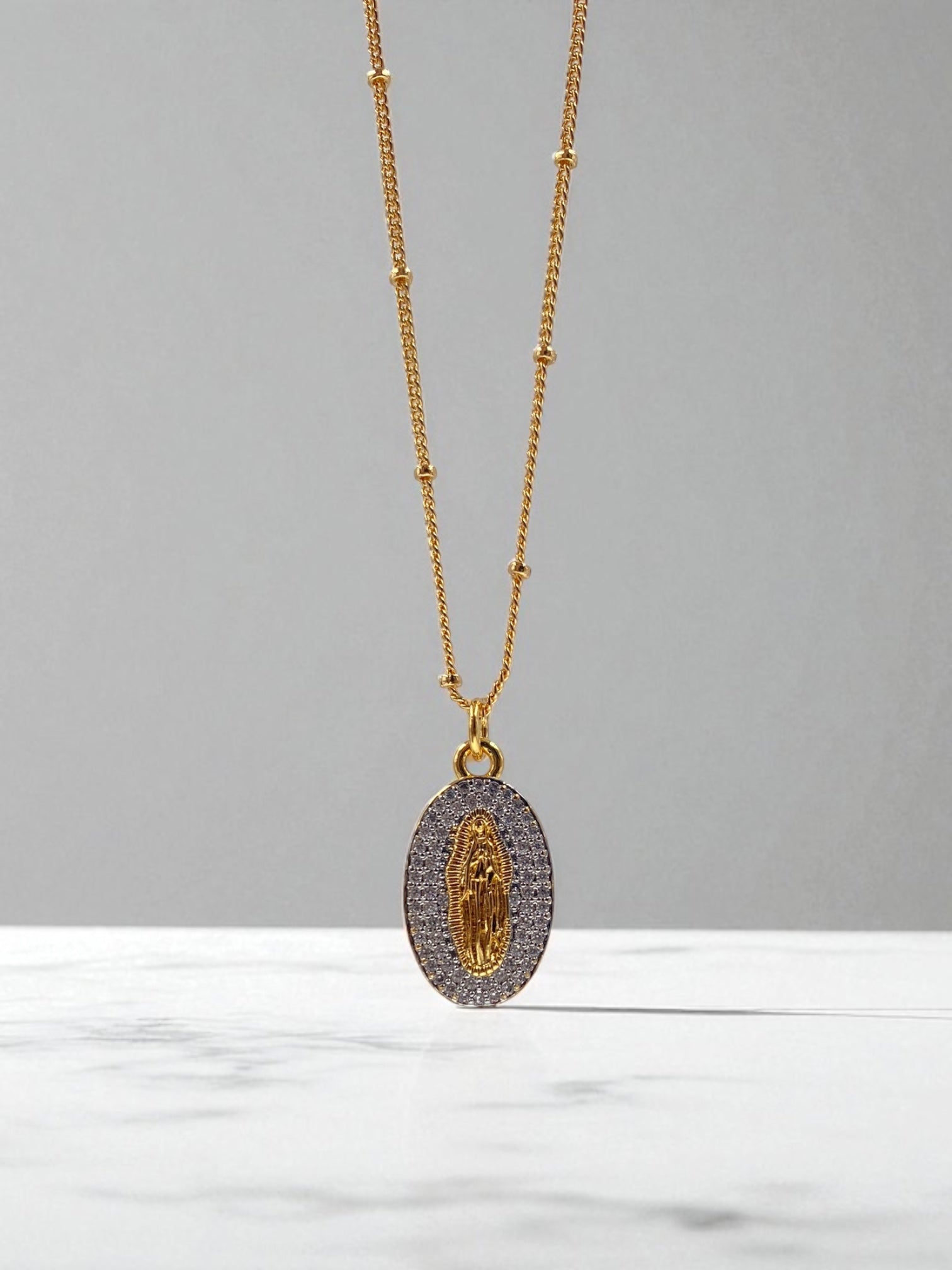 Este collar presenta una hermosa medalla de la Virgen de Guadalupe rodeada de circones brillantes, creando un halo de luz que enmarca su figura con delicadeza y poder espiritual.