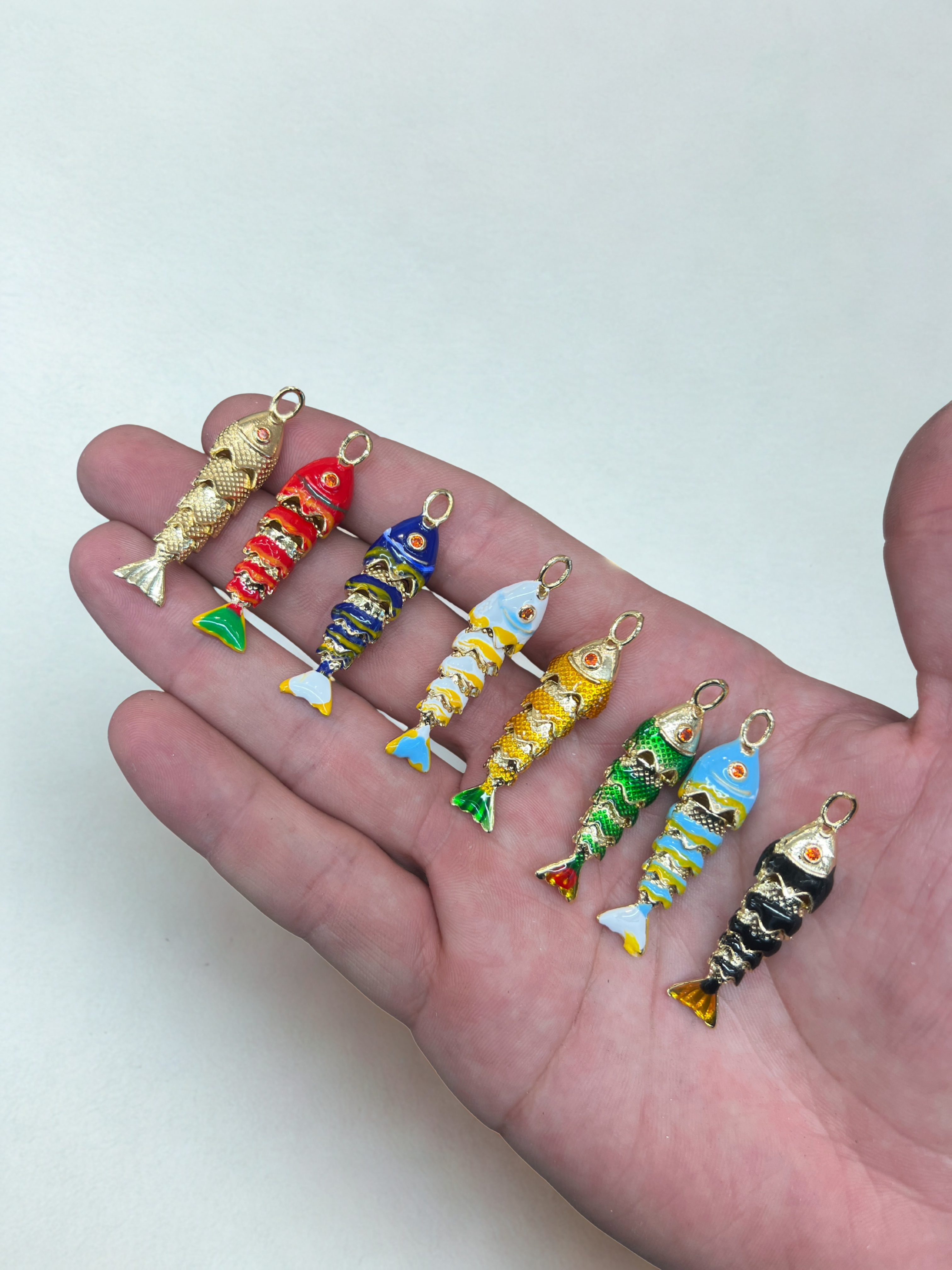 Su diseño articulado permite que el pez tenga movimiento natural, convirtiéndolo en una pieza llamativa y diferente. Disponible en 8 colores: Dorado, Rojo, Blanco, Azul Celeste, Azul Oscuro, Verde y Negro, ideales para combinar con cualquier look.